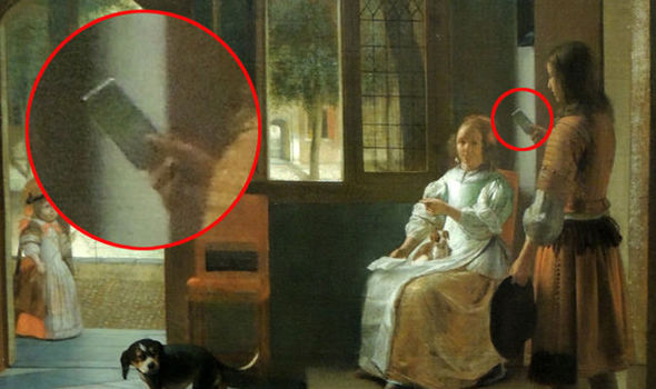 الصورة أعلاه المسماة “رجل يسلم رسالة إلى امرأة في قاعة مدخل المنزل” رسمها بيتر دي هوش في 1670 – لكنها أصبحت تُلقب الآن بـ “رجل سفر عبر الزمن يحمل iPhone”